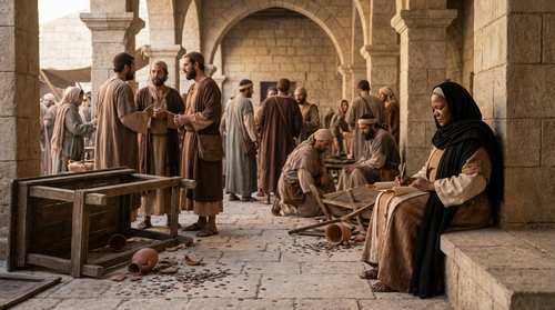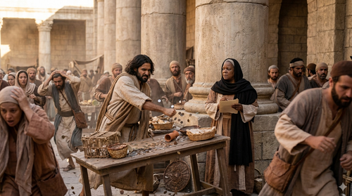 This is Hadassah, reporting from the temple courts. Moments ago, what began as ordinary activity has been completely overturned. Merchants have been driven out, tables overturned, and coins scattered across the ground. Jesus has declared that this place, meant for prayer, has been filled with distraction and misuse. I stood and watched as the crowd reacted with shock… yet there was something unmistakable in His actions. This was not chaos…this was correction.